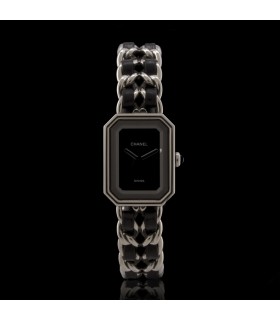 Montre bracelet de femme en acier, cadran noir, lunette octogonale. Mouvement quartz. Bracelet cuir et acier, maillons articulés avec fermoir à cliquet. Signée et numérotée W.N.78002.