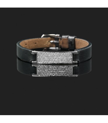 Bracelet en cuir noir centré d’une plaque ornée d’un pavage de diamants, agrémenté d’une boucle ardillon. Signé.