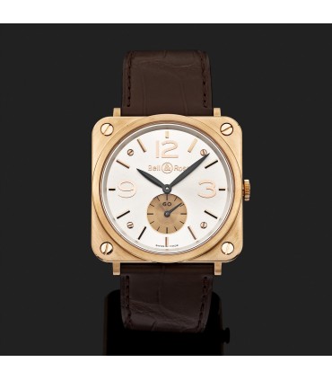 Montre bracelet en or rose, cadran argenté rayonnant avec chiffres arabes et index cuivrés, petite trotteuse à 6 heures, lunette carrée à décor de vis. Fond de boîte partiellement transparent dévoilant son mouvement mécanique. Bracelet crocodile marron avec boucle ardillon en or rose. Signée et numérotée BRS70R00106.