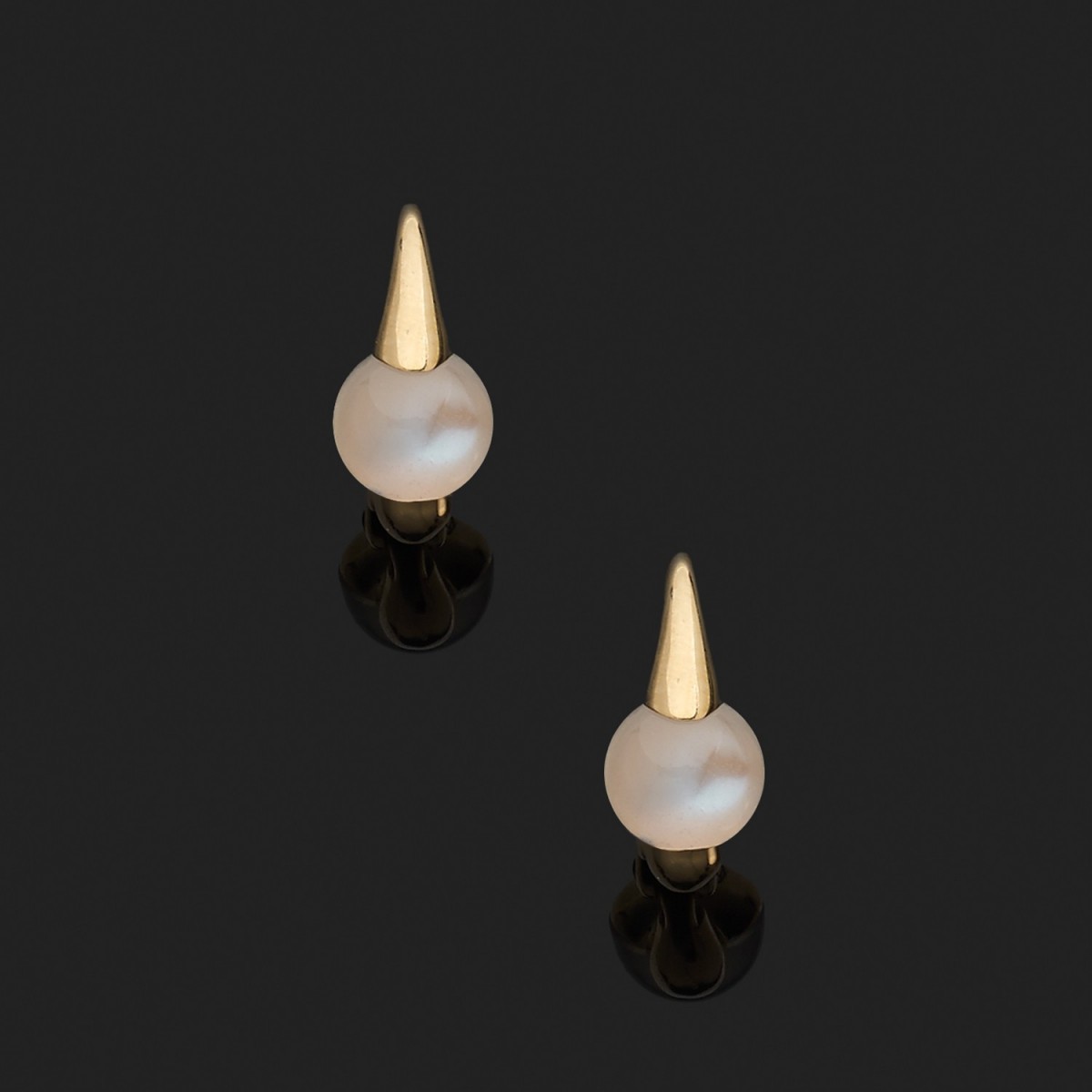 Boucles d’oreilles dormeuses en or jaune, ornées d’une pierre de lune taillée en cabochon. Signées.