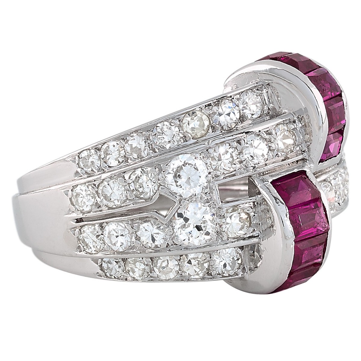 Bague en platine, à décor géométrique pavé de diamants taille ancienne et de rubis calibrés.