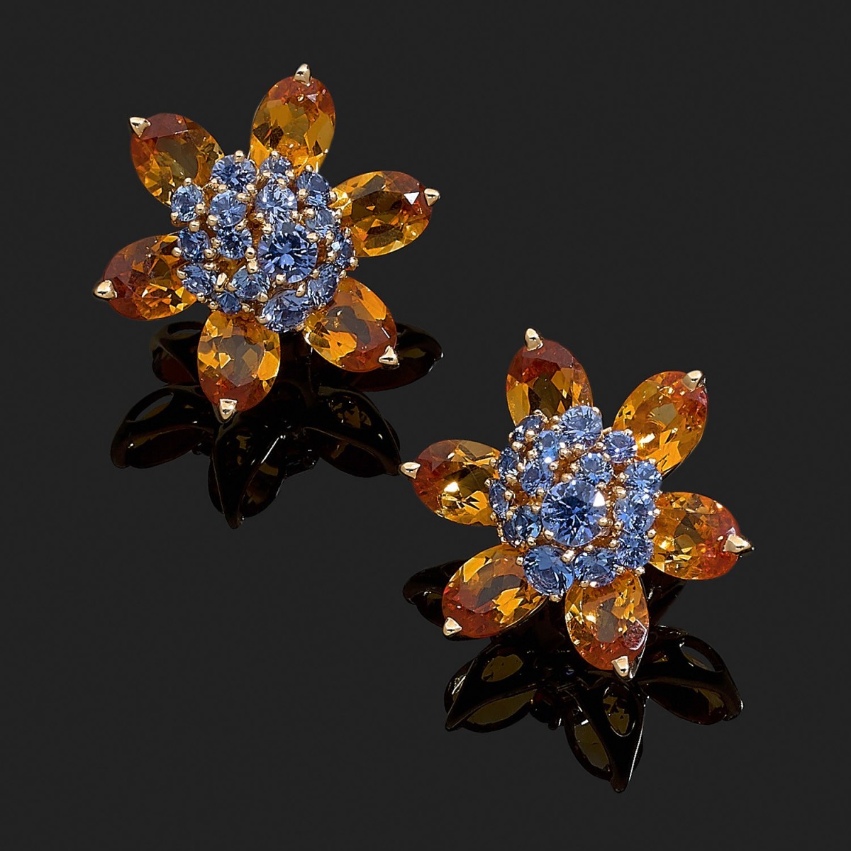 Boucles d’oreilles en or jaune, stylisant une fleur, le pistil ponctué de saphirs, les pétales ornées de citrines. Signées et numérotées.